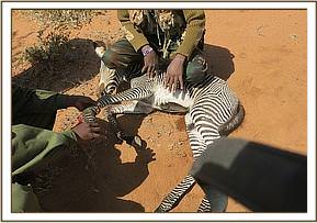 On 31/1/2016, the herd was found on an open plain with the help of scouts from the Grevys Zebra Trust. The calf was sedated with Azaperone 20mg delivered in a 1.5 cc Dan-Inject dart. Examination showed a comminuted fracture of the metacarpal bones. Due to the severe injuries this foal was euthanized by intravenous injection of Euthatal.