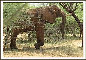 The wildlife monitoring team in MNP reported that this elephant bull had shown severe lameness and a swollen right hind leg. This animal was aggressive when approached. On 25/1/2016 an initial attempt by the KWS/DSWT Meru mobile veterinary unit to dart and examine the elephant by vehicle was futile after it ran into a thicket. Subsequent assessment by a helicopter on 28/1/2016 showed that this elephant had improved. There were no visible wounds and the swelling had reduced. Therefore no further intervention was required.