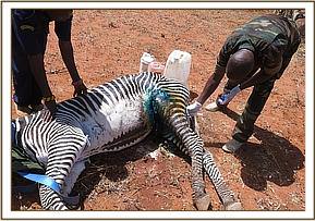 Rangers from Samburu national reserve (SNR) reported a Grevys zebra which had sustained injuries during a lion attack. This zebra showed severe lameness of the right hind leg. When the team visited the reserve the zebra was at the Oryx airstrip which provided an ideal ground for darting and treatment of wounds.