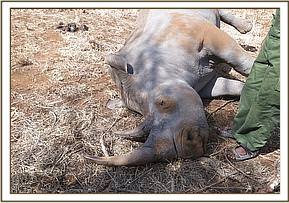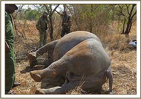 This white rhino was found dead by rangers on patrol. It had no recent history of illness. A post mortem examination was conducted on site to determine the cause of death.