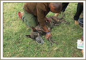 This tracker dog in Meru national park was reported to have shown mild lameness after a routine exercise on 27/7/2015. An examination of its right hind paw showed a puncture wound caused by a foreign body.