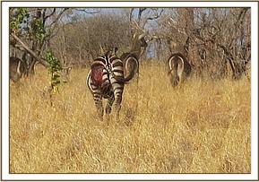 This injured zebra was seen during a routine patrol in Meru national park. It suffered a degloving wound on its left hind quarters suspected to have been caused in a lion attack. This herd of zebra was very shy and attempts to dart it for treatment were unsuccessful due to long flight distance.