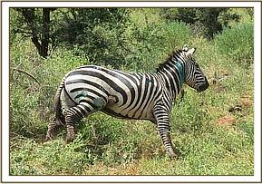This zebra was immobilized using a combination of Etorphine and Medetomidine Hcl delivered in a 3 cc DanInject dart from a vehicle. The first attempt at darting was not successful. Fifteen minutes later a second dart into the brachial muscle was given. After 12 minutes the zebra which was immobilized in a standing position was blind folded and tipped to lateral recumbency.