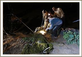 A capture net fastened to a tree stump at the river bank was set to allow the crocodiles walk through to the feeding point. Target animal was tactically isolated by prodding other individuals away and the net lunged onto the target. Once the crocodile was entangled in the net, he was held down and a blindfold thrown over its eyes.