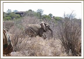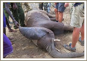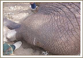 This elephant was immobilized using 16mg Etorphine hydrochloride in a 3cc Dan-Inject dart from a vehicle. The dart was placed into the left gluteal muscles and induction time was 5 minutes with the elephant falling onto right lateral recumbency.