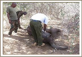 This elephant was darted with 16mg Etorphine hydrochloride 16mg in a 3cc Dan-Inject dart from foot. She was down after 6 minutes after which the calf was chased away.