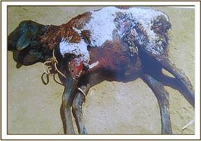 Examination showed a spear wound on the right flank penetrating into abdominal cavity which on probing with a forceps showed a pus sinus. The wound was thoroughly washed with water, antiseptic and povidone iodine. Betamox trihydrate 200ml was injected intramuscularly and multivitamin injection was also administered.