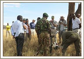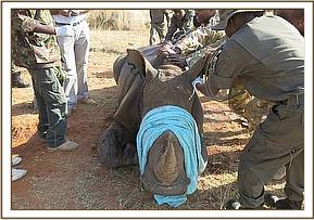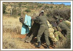 The white rhino candidate was identified by the rhino monitoring unit in LWC in an open plain which enabled the team to dart the animal from foot. The animal went down in 5 minutes, after which it was blind folded, positioned on sternal recumbency and vital parameters such as rate of respiration recorded.