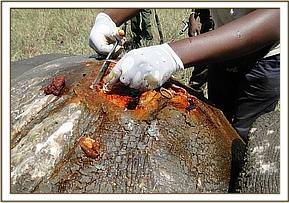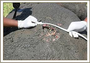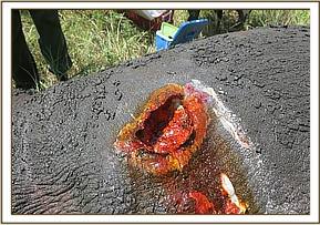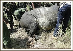 Examination showed lacerations on its external genitalia and hind quarters suggestive of fight wounds. These wounds may have been inflicted during attempted mating and consequent calf separation. Because of soft tissue trauma the rhino was reluctant to move.