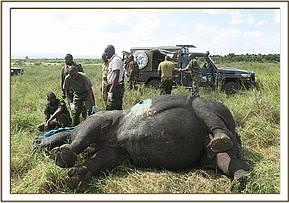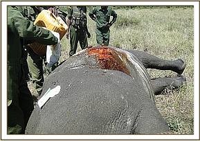 A white rhino was treated in Meru National Park for cutaneous filarial wounds following reports from the rhino monitoring team. Affected rhinos showed extensive wounds on the skin. Treatment was required to prevent wound expansion and infection.