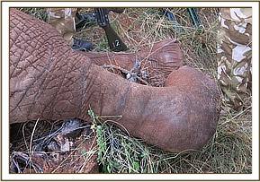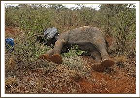 The elephant was darted at 5.15pm after tracking the herd in the thickets. For immobilization Etorphine Hcl 10mg in a 1.5cc DanInject dart was used. The dart was placed into the gluteal muscles and the elephant was down in 5 minutes.