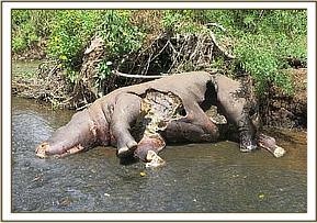The decomposing carcass was estimated at 3 days old and viscera had been extensively eaten by scavengers. No major findings were recorded during a post mortem examination because of the decomposed state of the carcass. Suspected cause of death was internal injuries sustained in a fight.