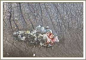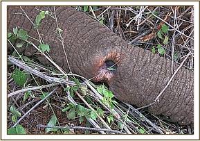 Examination revealed emaciation and a deformed right hind leg which caused lameness. There was a circular scar distal to the hock joint which may have been formed by a wire snare on the leg. This constriction caused a deformity on the leg and the snare later fell off. There was a healing wound on the middle part of the trunk.