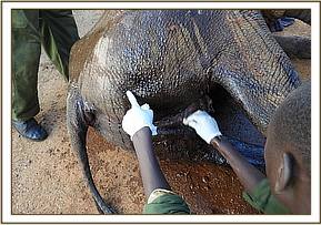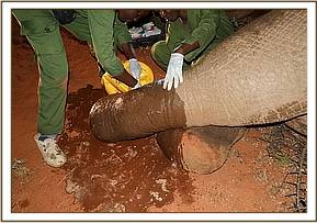 Initial assessment showed severe lameness and swelling on the distal part of the left hind leg, no physical injury was seen. Its body condition was fair. It was darted from foot with Etorphine Hcl 12mg in a 1.5 milliliter Dan-Inject dart with the dart placed into the gluteal muscles. Induction time was six minutes after which the elephant was positioned on lateral recumbence for examination and treatment.