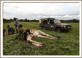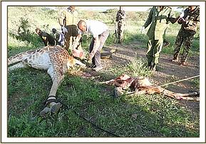 The giraffe was alone, restless and had lost body condition (body score 1.5 on a scale of 1 – 5) as a consequence of toxaemia from the decomposing fetus. The vet used a lower dosage limit for anesthesia due to its poor body condition. Immobilization was achieved using Etorphine Hcl 8mg and Azaperone tartarate 40mg combined in one intramuscular 3ml Dan-inject dart from a vehicle. Five minutes after darting the giraffe was brought to right lateral recumbence with ropes and physically restrained. Anesthesia was reversed immediately by intravenous injection of Diprenorphine hydrochloride 30 mg through the jugular vein.