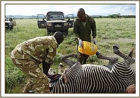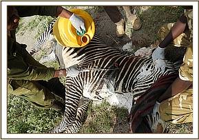 The grevy was immobilized using Etorphine hcl 5mg and Azaperone tartarate 80mg combined in one Dan-inject intramuscular dart. The vet darted the zebra from a vehicle.