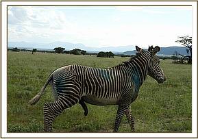 The adult male grevy zebra had survived a predator attack but sustained injuries to its right front leg. The male which was alone, grazing intermittently showed discomfort and pain with lameness. There was a large penetrating septic wound on the left lateral aspect of the neck just dorsal to the jugular groove. There was matting of hair in the surrounding neck region.