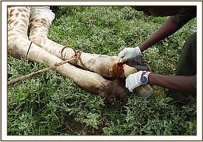 This giraffe in the Aberdare Country Club (ACC) showed progressive lameness for two weeks but the situation had deteriorated prompting need for intervention. The animal presented with weight shifting lameness favoring its right forelimb which had an avulsion wound around the coronary band probably from an injury from rocks in the rocky terrain of ACC.