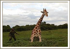 The animal was immobilized with Etorphine hcl 10mg and Azaperone tartarate 40mg combined in one intramuscular 3ml Dan-inject dart. The animal was brought down using ropes and restrained physically. Anesthesia was reversed immediately the animal was recumbent using Diprenorphine hydrochloride 30 mg administered intravenously at the jugular.
