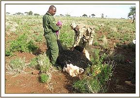 This ostrich had a loose wire snare around its left hock joint and was reported by rangers on patrol in Meru national park. On receiving this report the veterinary team immediately immobilized the ostrich to remove the snare.