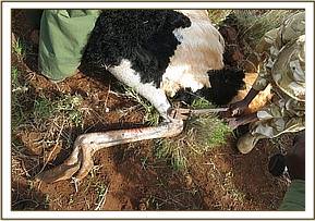 On contact with the immobilized ostrich he was blind folded and its head was raised above the body to prevent regurgitation. Examination showed a loose wire snare and bruises around the hock. Snare knot was untied and topical antibiotic was applied on the bruised leg.