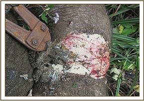 Examination showed a swollen left forelimb with a septic wound inflicted by a tight snare around the carpus. The snare was deeply embedded in the leg muscles and was made from tough synthetic fabric with several strands of fiber causing severe tissue strangulation.