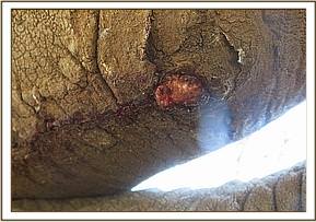 Examination showed a perforation on the mid ventral aspect of its trunk. This was an old wound which had healed with red scar tissue formation and deformity of the trunk. The cause of this traumatic injury could not be established.