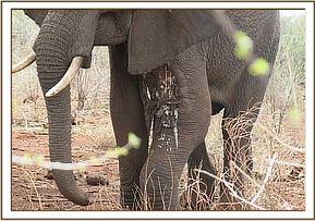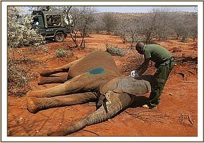 A helicopter was provided by the DSWT to dart this elephant. Captivon® 20mg was delivered in a 3cc Dan-Inject dart to the dorsal lumbar muscles and the anesthetic took effect within 5 minutes. The elephant was examined on left lateral recumbence after dousing the injury with plenty of water and covering its eyes with the ear flap.