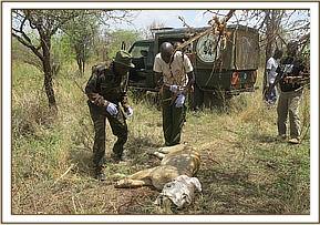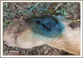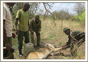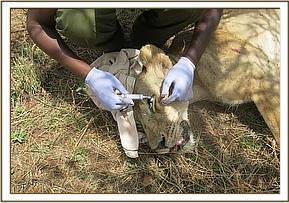 This lioness was in good body condition. A minor laceration was noted on the medial claw of the left forelimb which was treated by cleaning and application of Iodine antiseptic.