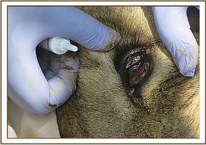 A combination of Ketamine and Medetomidine delivered in a Dan-Inject dart provided effective anesthesia. Full sedation was attained 9 minutes after darting. A blind fold was applied to prevent visual stimulation and the animal was positioned on lateral recumbence for examination and treatment.