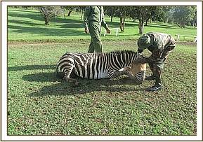 Immobilization was achieved by darting from a vehicle using a combination of Captivon® and Azaperone delivered in a Dan-Inject dart into the gluteal muscles. After 4 minutes the zebra fell onto sternal recumbency and was tipped to left lateral recumbence and a blindfold applied for examination.