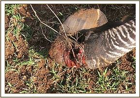 Considering the debilitating injury caused by the snare, we recommended euthanasia to relieve pain and suffering of this zebra.