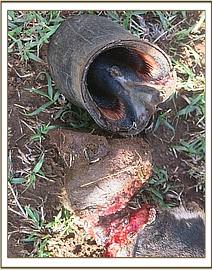 Examination revealed that the wire snare caused fetlock joint disarticulation and infection, coronary band necrosis and loss of the hoof.