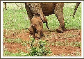 This elephant calf and its dam were in a herd of eight elephants. We first immobilized the mother using Etorphine hydrochloride 14mg into its thigh muscle muscle. As the drug took effect the rest of the herd was chased away by vehicle and the calf restrained physically using ropes for treatment.
