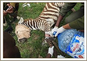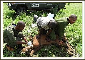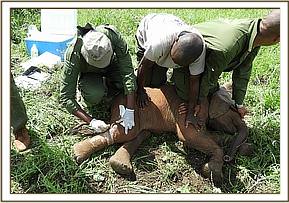 Examination showed an open abscess distal to the right stifle joint. Treatment was by lavage using hydrogen peroxide and application of povidone iodine. Green clay was also applied. Parenteral antibiotics and anti-inflammatory drugs were given.Anesthesia was reversed using Naltrexone hydrochloride, when the dam showed signs of recovery the calf was released and were later reunited.