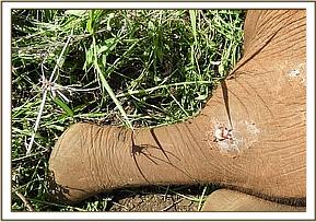 We found this juvenile elephant which showed lameness on its right hind leg while on routine patrol within Meru national park. Visual examination showed a swelling and pus discharge distal to the knee joint.