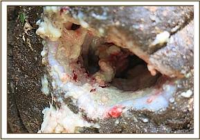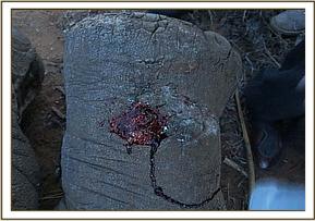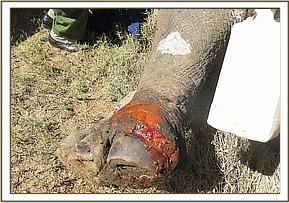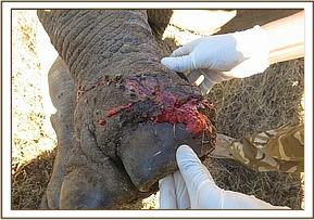 The elephant showed lameness and a swollen right forelimb with a penetrating wound 5cm in diameter and 15cm deep caused by a sharp object into the muscles of the arm. There were two penetrating wounds with extensive necrotic tissue on the left thoracic area also deep caused by sharp object.