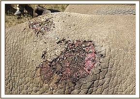 Wildlife scouts attached to the Milgis Trust reported a sick adult (>35 years old) male elephant in Sererit, at the foot of Ndoto mountains which required veterinary attention. The elephant had a wound which was discharging pus dorsally on its flank thought to have been caused by gunshot injury.