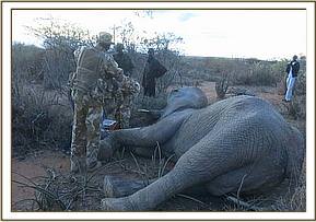 The sick elephant was tracked by local wildlife scouts who followed his movements for 3 days to an open area in a lugga which was considered suitable for darting.