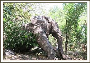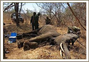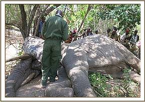 Standard elephant immobilization procedure was followed. A combination of Etorphine Hcl 18mg with hyaluronidase 5000 i.u was used to achieve effective immobilization in the wooded riparian area. Darting was conducted on foot with the dart placed on the left gluteal muscles. The animal fell on sternal recumbency after 6 minutes. To reverse the anesthesia, Diprenophine Hcl 60mg was infused into the superficial ear veins.