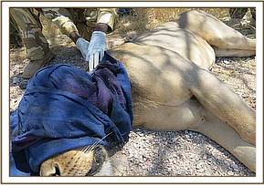 A 6 year old male lion was reported injured in Shaba national reserve by the Isiolo county game rangers on 22nd October. The animal was seen limping and showed little movements in the preceding two days and it was feared he was unable to hunt. He was immobilized for examination and treatment.