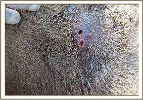 Two infected penetrating wounds distal to the carpal joint of the left forelimb were observed. The wounds are thought to have been caused by gunshot. On probing with a forceps bone fragments were felt. Prognosis for recovery is guarded.