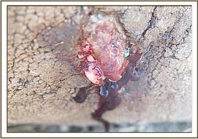 Treatment was achieved by wound debridement with Hydrogen peroxide and cleaning with antiseptic. A long acting antibiotic was injected to control infection spread.