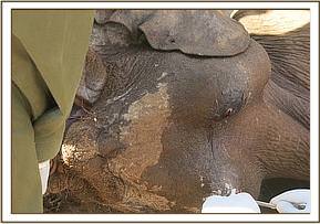 Immobilization was achieved using M99 6mg in a single 1.5cc Dan-inject dart from a vehicle with the dart placed at the abdominal muscles. Down time was 8 minutes with the elephant lying on right lateral recumbency.