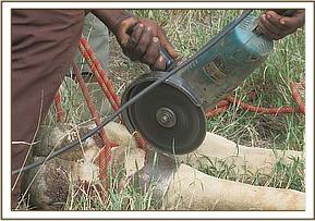 The steel bracelet was cut using an electric grinder and removed. The metallic object resembled a worn out motor vehicle part which had somehow accidently got stuck on the giraffe’s foot.
