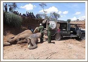 Livestock herders found this recumbent elephant in a lugga (dry river bed) in Dol Dol. It showed no apparent injury but was believed to have fallen off a cliff at night as it was browsing nearby acacia. There was a steep 12 foot cliff at the bank of the lugga.