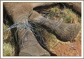 This elephant was successfully immobilized using Etorphine hydrochloride. The wire was cut using a wire cutter and removed.