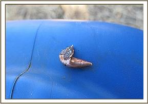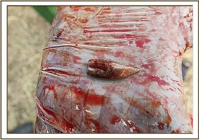 The calf died instantly from gunshot injuries and a P.M examination performed with projectiles recovered in the dorsal processes of T3 vertebrae and the tarsal joint.