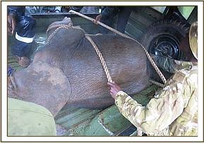 The dam which showed severe lameness was immobilized to examine the extent of injuries. Darting was conducted on foot. We used a combination of Etorphine Hcl 5mg and Xylazine Hcl 60mg in a single 1.5cc DanInject dart. After the procedure the animal was revived using a combination of Naltrexone 150mg and Antisedan 8mg administered intravenously.