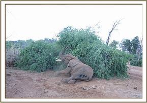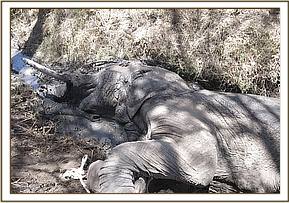 Immobilization was achieved using M99® 14mg in a single 3cc Daninject dart. Darting was done by foot, after stalking this elephant, with the dart placed at the gluteal muscles. Down time was 8 minutes with the elephant lying on right lateral recumbency.